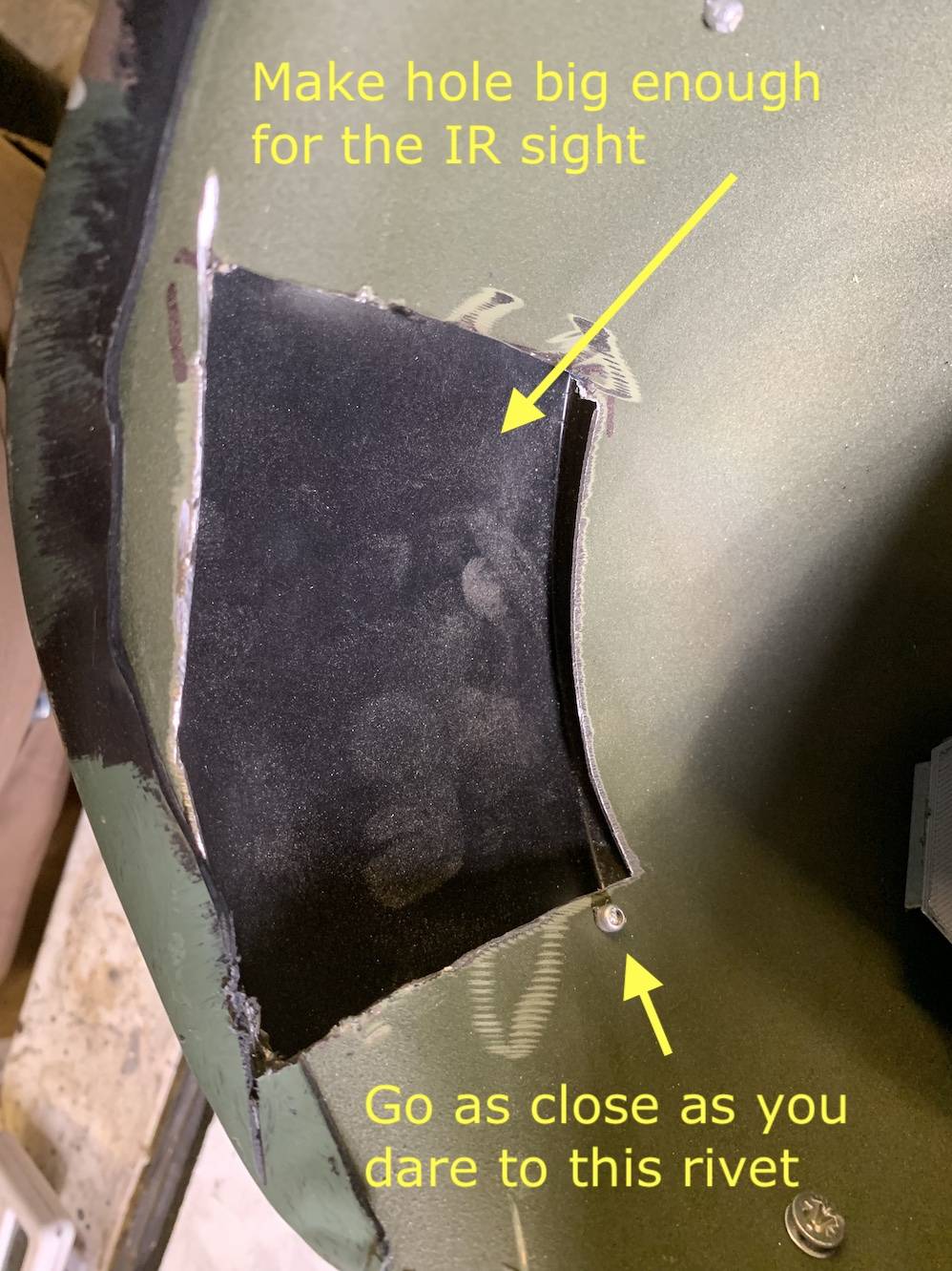 Place your IR sight inside the helmet, and Mark the inner edge right up against that rivet hole, leaving just enough meat for the rivet to grab.
