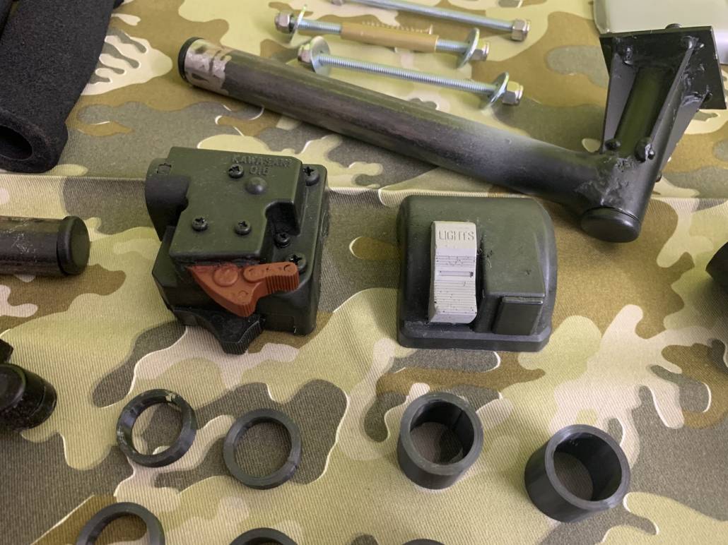 The dress up parts are resin cast from original AR Hangers and the correct Kawasaki switch gear.